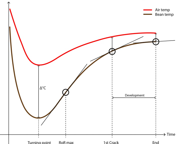 Kurva suhu biji kopi mencatat suhu pada biji kopi. Sedangkan RoR menggambarkan kecepatan kenaikan suhu pada biji kopi dalam periode tertentu (biasanya 30 detik). RoR memiliki bentuk grafik yang berbeda dengan kurva suhu biji kopi. Di awal proses roasting, terjadi penurunan suhu (fase pengeringan) yang kemudian menjadi stabil ketika suhu drum dan suhu biji kopi sama (titik balik), sehingga pada saat ini terjadi RoR bernilai positif.